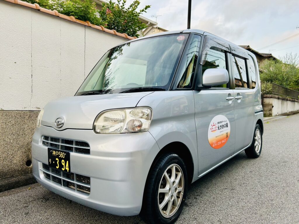 ダイハツのタントです。後ろはスロープが付いていて、車椅子が乗せられるようになっている福祉車両です。本日よりこのタントを使って訪問させていただきます。